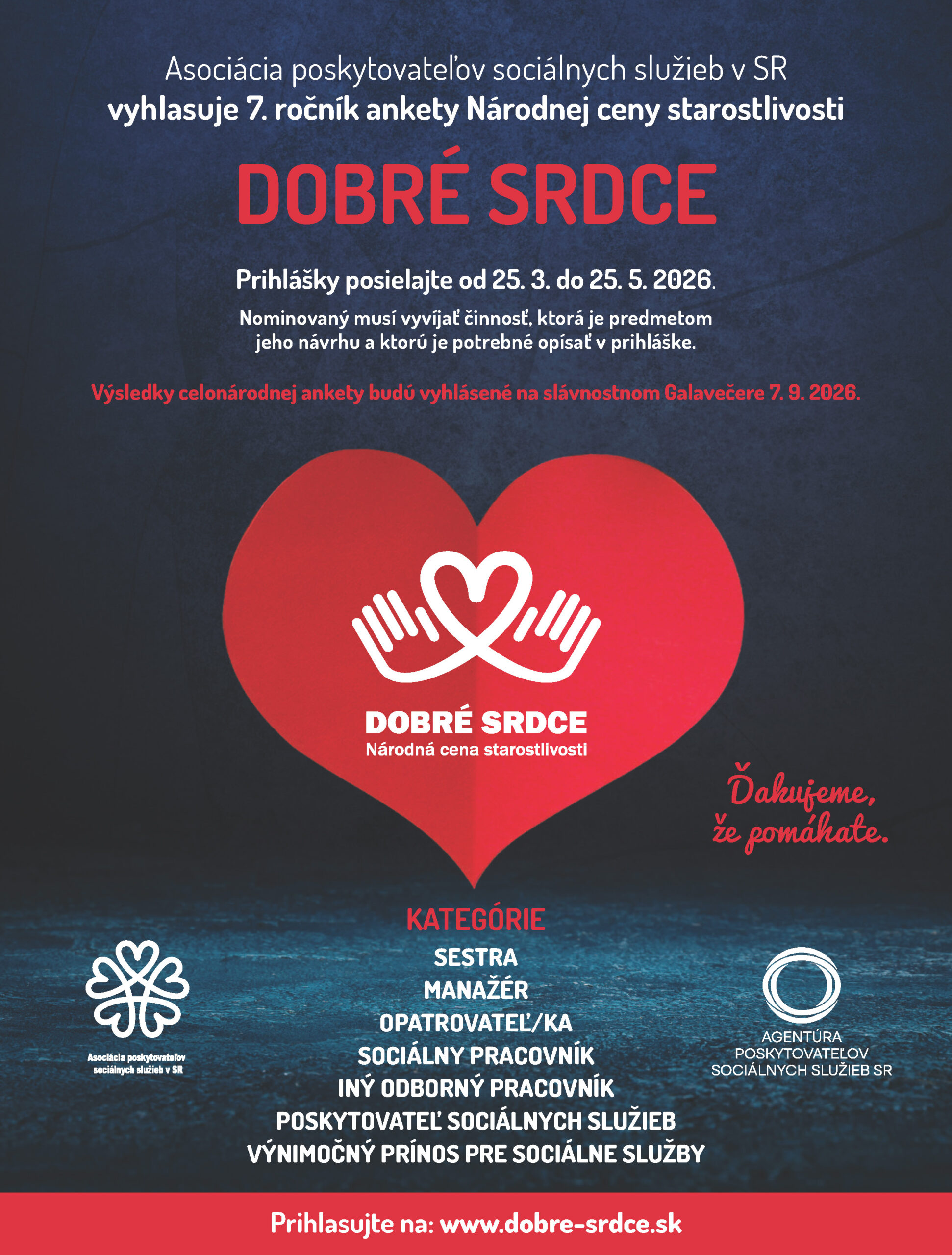 Prihlasovanie nominácii do 7. ročníka Národnej ceny starostlivosti – DOBRÉ SRDCE je otvorené do 24.5.2026.